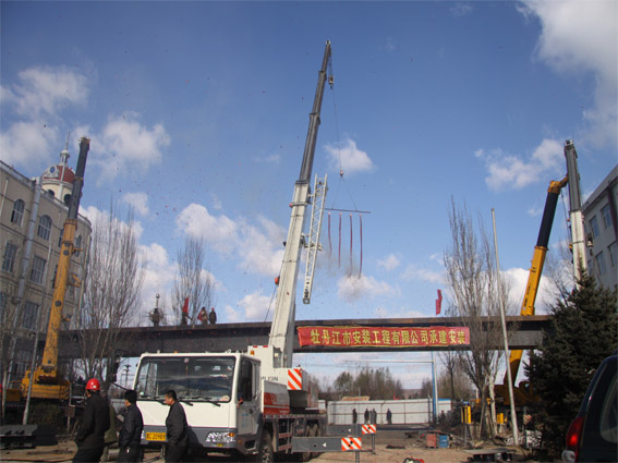 由我公司施工的牡丹江市興中路人行天橋工程,于2010.10.26上午10時(shí),將總重量為80噸的鋼梁整體一次吊裝就位。